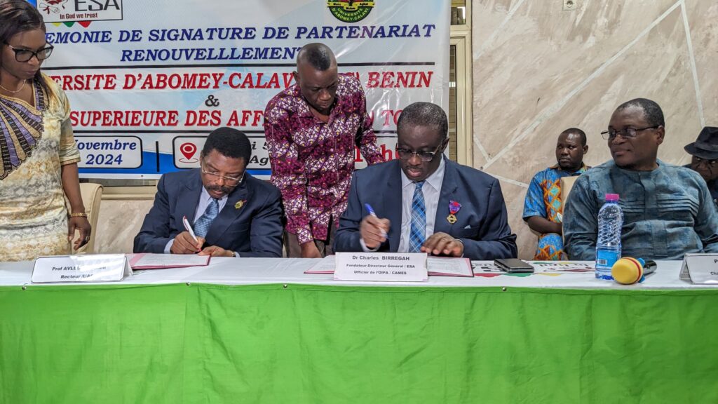 La cérémonie officielle de renouvellement du partenariat entre l’École Supérieure des Affaires (ESA) du Togo et l’Université d’Abomey-Calavi (UAC) du Bénin s’est tenue ce samedi 2 novembre 2024, marquant une avancée importante dans la collaboration académique entre les deux établissements. Le recteur de l’UAC, Prof Félicien Avléssi, accompagné de ses deux vice-recteurs, était présent pour célébrer cet accord qui renforce les liens éducatifs et favorise l’échange de connaissances.