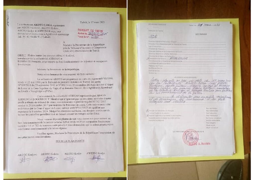 Dans une note en date du 17 mars 2025 et adressée à Mme la Procureure de la République près le Tribunal de première Instance et de compétence civile et correctionnelle de Tsévié, la collectivité Akoto-Loga a porté plainte contre les nommés Abalo Kodjovi, mandataire de la collectivité Ayissan dérivée des Agbomlan, et Kombate François, pour entrave au bon fonctionnement de la justice et occupation frauduleuse.
