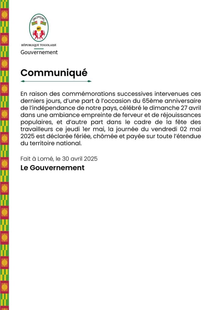 Le Gouvernement togolais a annoncé ce mercredi que la journée du vendredi 2 mai 2025 sera fériée, chômée et payée sur toute l’étendue du territoire national.