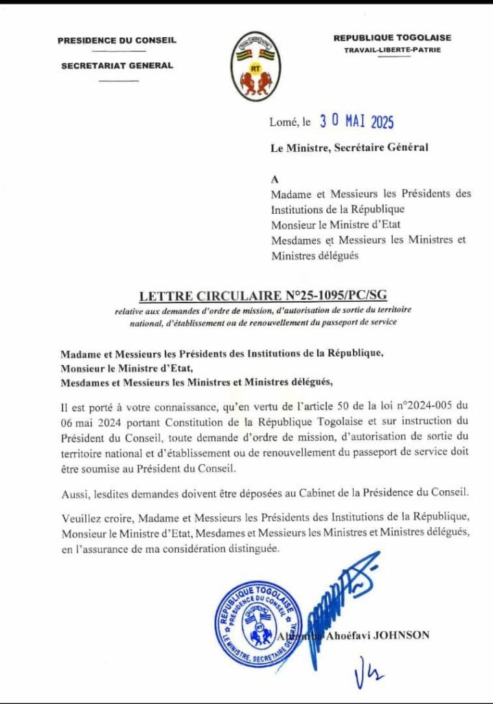 Elle stipule que toute demande d’ordre de mission, d’autorisation de sortie du territoire national, ainsi que d’établissement ou de renouvellement de passeport de service, doit désormais être soumise à l’approbation du Président du Conseil. Mais à y regarder de plus près, cette mesure ne constitue pas une rupture, encore moins une nouveauté. Elle s’inscrit dans la continuité d’une pratique administrative togolaise remontant à plus de trois décennies.