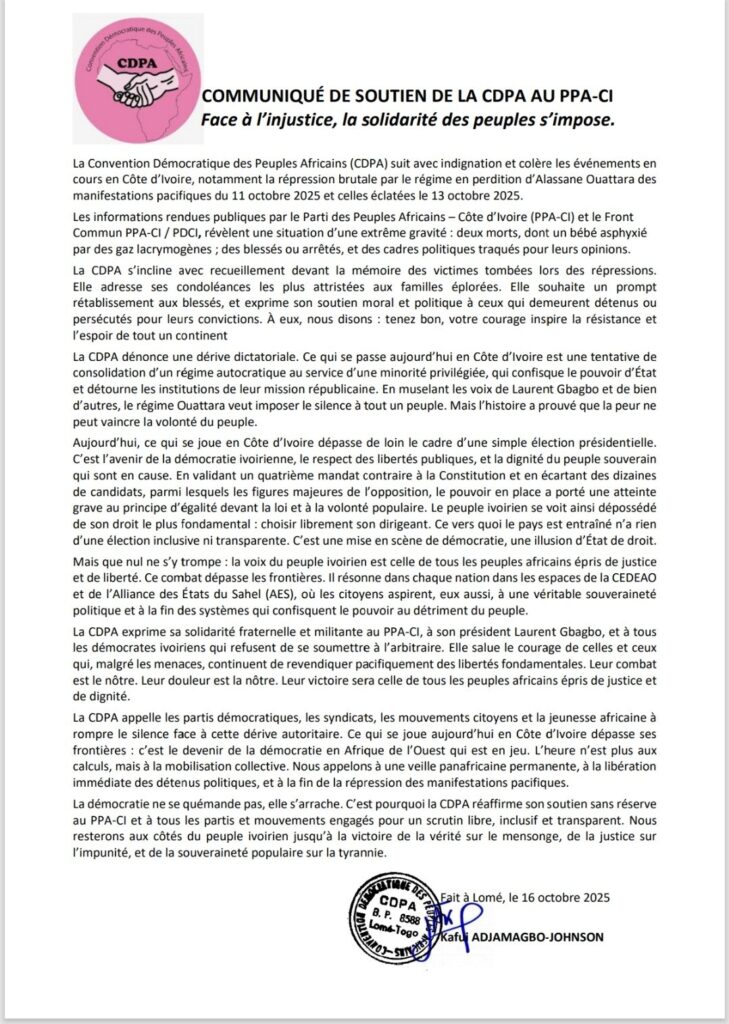 La tension politique en Côte d’Ivoire continue de susciter des réactions au-delà des frontières. À Lomé, la Convention Démocratique des Peuples Africains (CDPA) a publié, ce 16 octobre 2025, un communiqué dans lequel elle condamne fermement la répression des manifestations pacifiques en Côte d’Ivoire et affirme son soutien au Parti des Peuples Africains-Côte d’Ivoire (PPA-CI), présidé par Laurent Gbagbo.