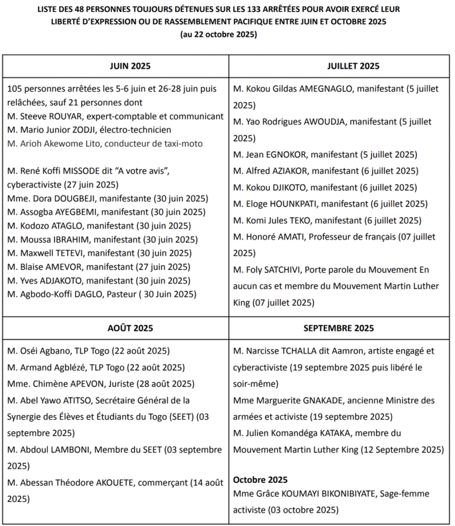 Vingt organisations de la société civile, nationales et internationales, appellent à la libération immédiate et inconditionnelle de 48 jeunes activistes togolais encore détenus depuis les vagues d’arrestations qui ont suivi les manifestations de juin 2025. Selon ces organisations, au moins 133 personnes ont été arrêtées arbitrairement pour avoir participé à des rassemblements pacifiques ou exprimé des opinions critiques à l’égard du pouvoir.