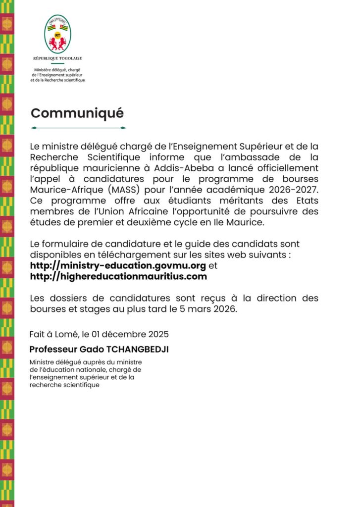Le ministère délégué en charge de l’Enseignement supérieur annonce l’ouverture des inscriptions pour le programme de bourses Maurice-Afrique Scholarship Scheme (MASS), destiné aux étudiants souhaitant poursuivre des études de premier et de deuxième cycle à l’île Maurice pour l’année académique 2026-2027.