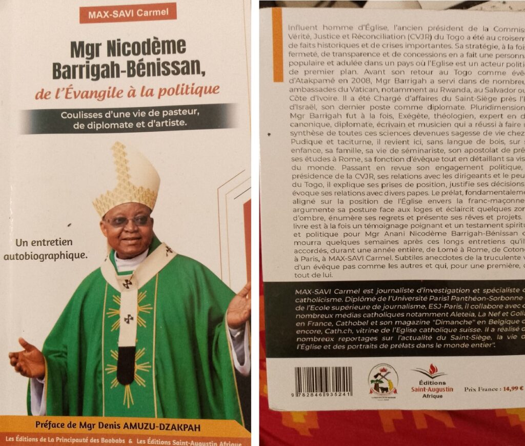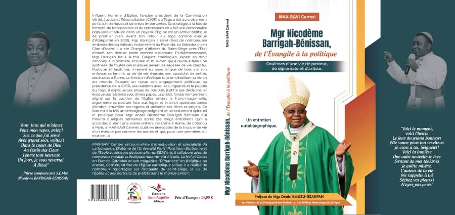 Publié par les Éditions de La Principauté des Baobabs, un éditeur proche de la micronation éponyme, en coédition avec les Éditions Saint-Augustin Afrique, l’ouvrage « Mgr Nicodème Barrigah-Bénissan, de l’Évangile à la Politique » est le fruit d’un long entretien autobiographique mené par le journaliste Max-Savi Carmel. Réalisées au fil de voyages avec le prélat, à Lomé, Rome, Cotonou, Paris et Bruxelles, ces conversations livrent un témoignage rare sur la trajectoire d’un homme au croisement de l’Église, de la diplomatie et de l’histoire politique togolaise.